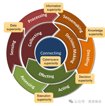 一种广泛使用的模型是美博伊德提出的观察-判断-决策-行动(OODA)环。OODA全面概述了有效指挥控制的基本前提:一个实体(无论是个人还是组织)能够快速处理这一周期,比对手更快地观察和应对正在发生的事件,从而“进入”对手的决策周期并获得优势。OODA环表明,在做出决策(决策阶段)之前,指挥官必须先收集信息(观察阶段),并确定其意义和可能的行动(判断阶段)。“缩短循环”可能成为胜负的关键。